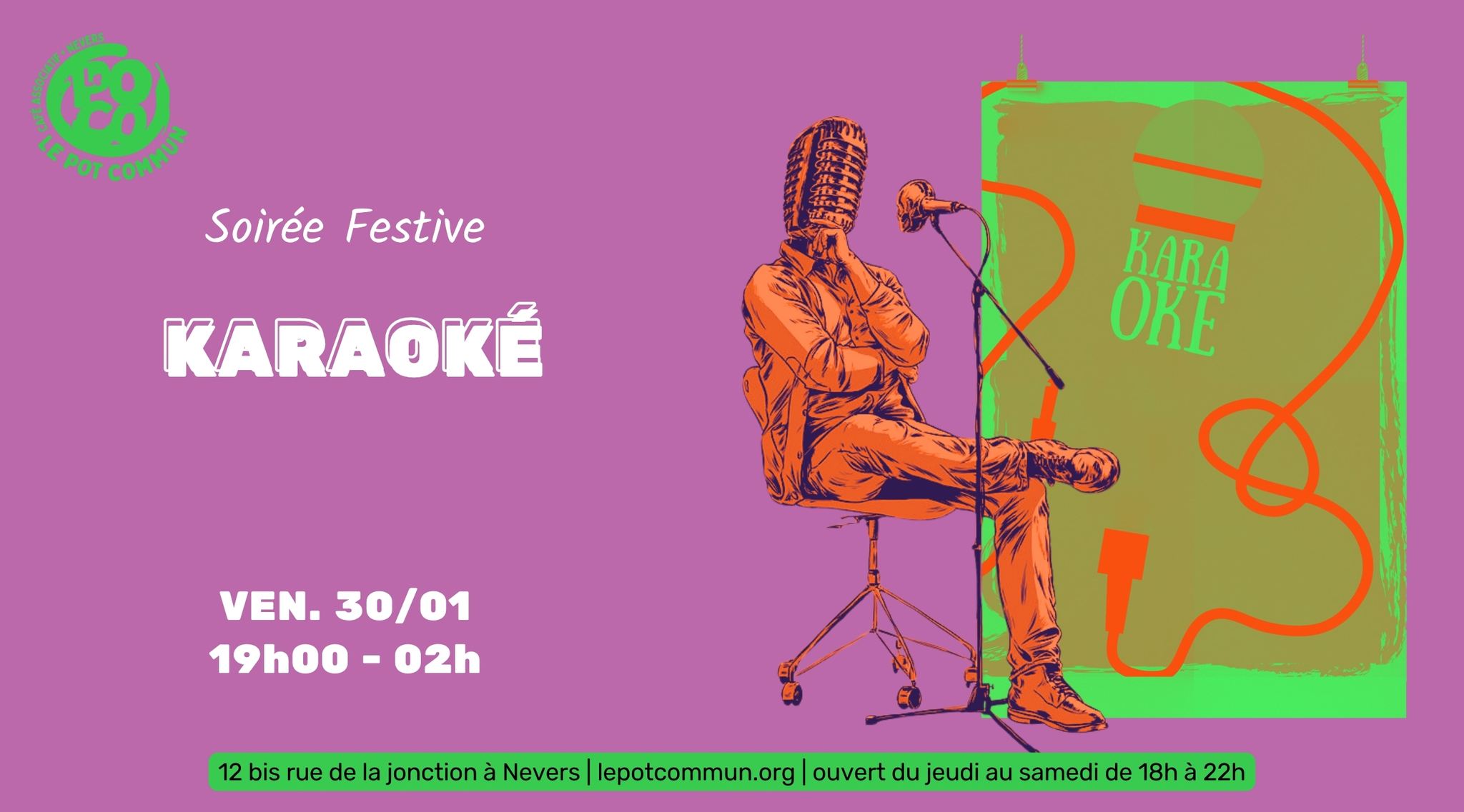 Tu ne voudrais pas rater une soirée karaoké délirante où se mêlent hits épiques et performances hilarantes. Alors viens avec tes amis, laisse tes inhibitions au vestiaire et c’est parti pour un moment de musique, de rires et de plaisir sans limites ! Vocalises sauvages et fausses notes sont les bienvenues !