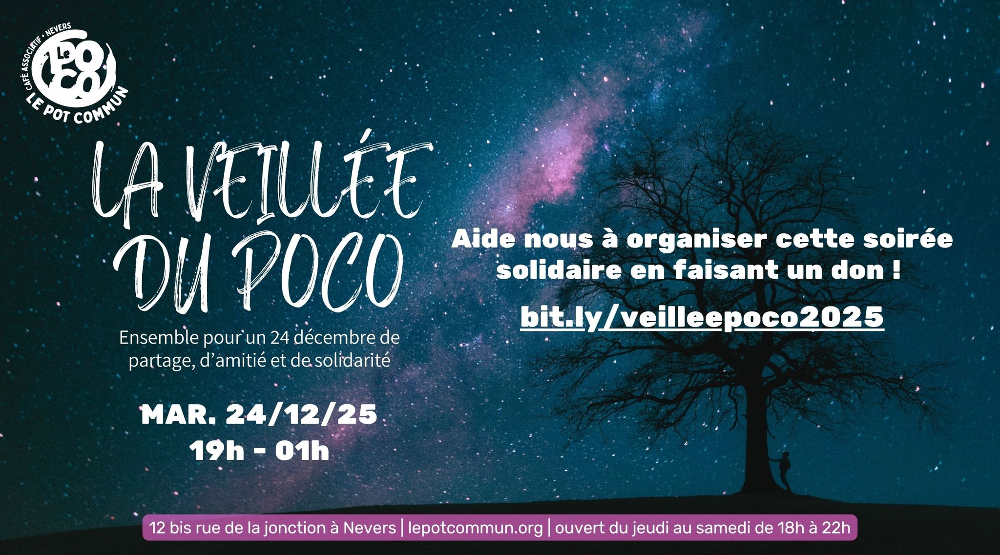 Tu peux quand même participer à ta manière à ce beau moment en faisant un don pour nous aider à financer le repas solidaire, directement au bar ou sur la cagnotte en ligne : bit.ly/veilleepoco2025