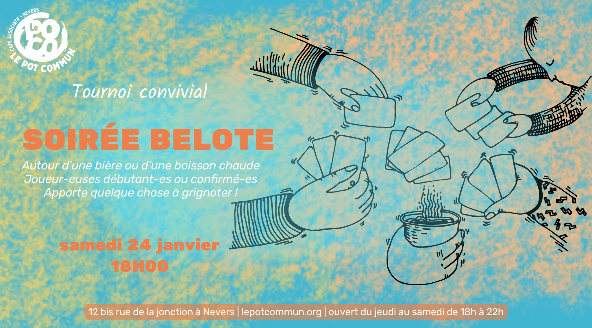 Passionné-e de belote, juste curieux-se, ou simplement à la recherche de moments chaleureux et conviviaux, on te propose un samedi soir autour d’un jeu de belote.