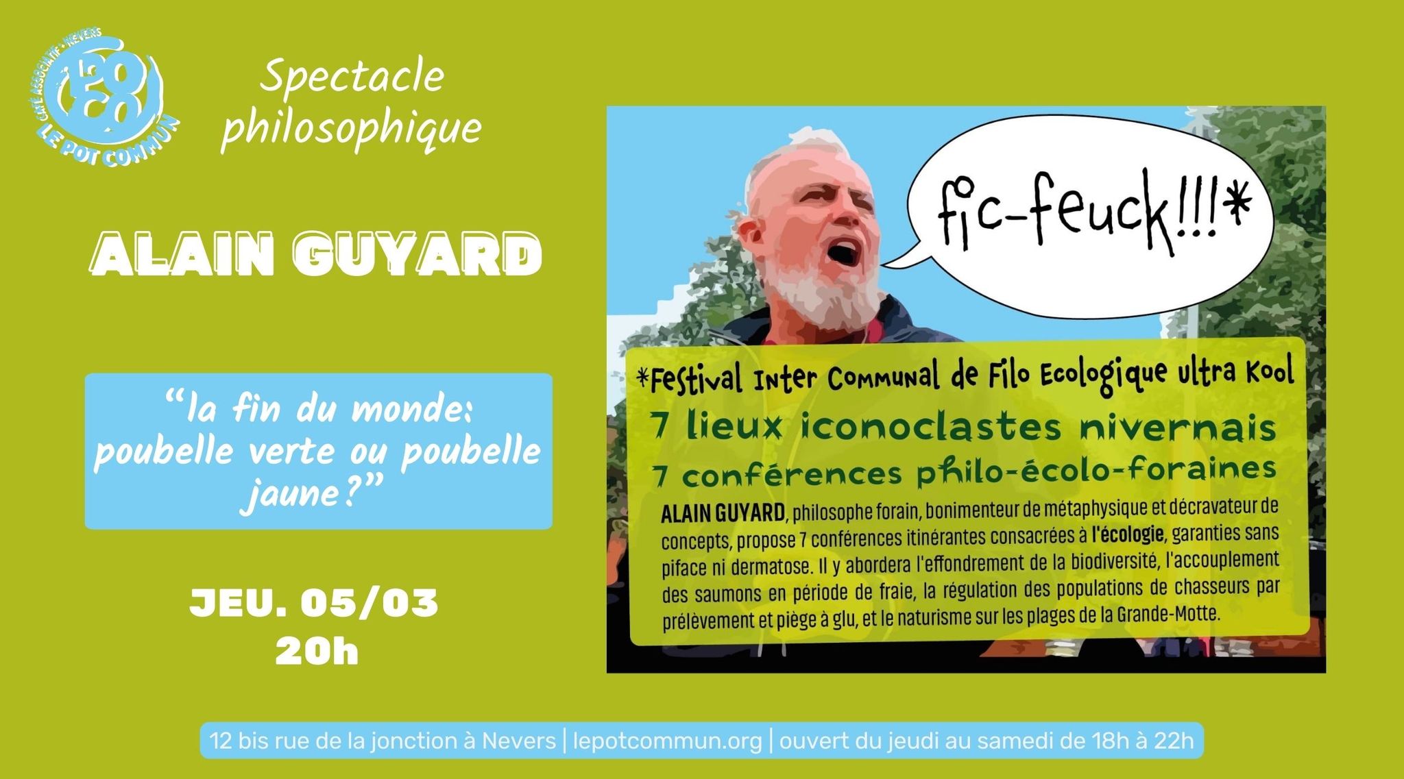 🤩Au POCO : ALAIN GUYARD, philosophe forain, bonimenteur de métaphysique et décravateur de concepts, propose 7 conférences itinérantes consacrées à l’écologie, garanties sans piface ni dermatose.